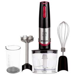 Блендерный набор, 800 Вт, мощный и тихий DC мотор, 2 скорости работы + дополнительная регулировка, острые лезвия из нержавеющей стали, 3 насадки (блендер, венчик, чоппер 0,5 л), стакан (0,5 л), погружная часть блендера из нержавеющей стали. Цвет: черный/красный.