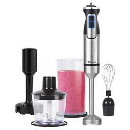 Тип: блендерный набор; Мощность: 1500Вт, DC мотор; Режимы работы: 2 скорости работы: нормальная скорость с дополнительной регулировкой и турбо-скорость; Комплектация: насадка-венчик для взбивания, насадка-чоппер (0,5л), насадка для картофельного пюре, градуированный стакан (0,6л) с силиконовой крышкой-подставкой; Цвет: черный / стальной; Материал: нержавеющая сталь, пластик, силикон; LED подсветка; Длина шнура 100см