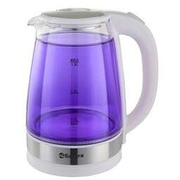 2.0 л, 1500-1800 Вт, двухслойный корпус (стекло внутри, полупрозрачный цветной пластик снаружи), диск, вращение на 360°, точечная подсветка, отключение при закипании и включении без воды, индикатор работы. Длина шнура 0,6м.
