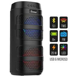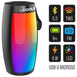 ПОРТАТИВНАЯ АКУСТИЧЕСКАЯ СИСТЕМА Номинальная выходная мощность (RMS): 6 Вт Пиковая выходная мощность (PMPO): 10 Вт Динамик: 2” Bluetooth 5.0 Поддерживаемые аудиоформаты: MP3, WAV Функция True Wireless Stereo (TWS) Цифровой FM-тюнер (87.5-108 МГц) Воспроизведение с USB 2.0 и microSD карты Встроенная аккумуляторная батарея: 300 мАч Время работы от аккумулятора до 6 часов* Многоцветная LED подсветка Размеры устройства: 155 х 62 х 62 мм Цвет: черный