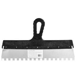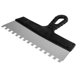 Шпатель Sparta 85130 из нержавеющей стали, шириной 300 мм, с пластмассовой рукояткой и зубьями 10 х 10 мм, применяется во время проведения работ по укладке плитки, мозаики и т. д. Квадратные зубья облегчают нанесение клеевого состава, позволяя равномерно распределять его по поверхности. Зубья размером 10 х 10 мм рассчитаны на плитку площадью 900-2500 см2. Преимущества Упругость — полотно быстро восстанавливает свою форму при изгибающих нагрузках. Коррозионная стойкость — рабочее полотно выполнено из нержавеющей стали. Комфортная эксплуатация — наклонная рукоятка облегчает нанесение и выравнивание раствора. Эргономичность — за счет рельефной текстуры рукоятка удобно ложится в руку и не выскальзывает из ладони. Удобное хранение — в рукоятке предусмотрено отверстие для подвешивания шпателя.