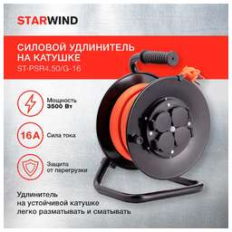 Количество розеток: 4. Длина кабеля: 50. Заземление: есть. Тип провода: ПВС. Комплектация: катушка. Сила тока: 16. Цвет: оранжевый. Максимальная мощность: 3.5. Особенности: Защита от перегрузки.. Габариты упаковки (ед) ДхШхВ: 0.28x0.23x0.375. Вес упаковки (ед): 9.25. Страна производства: Китай. Гарантия: 12 мес.. Сечение кабеля: 3x2.5 кв.мм. Максимальная мощность: 3.5 кВт. Количество розеток: 4 шт. Сила тока: 16 A. Кабель: 50 м, 3x2.5 кв.мм, с заземлением, тип провода ПВС. Комплектация: катушка