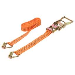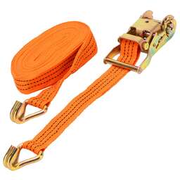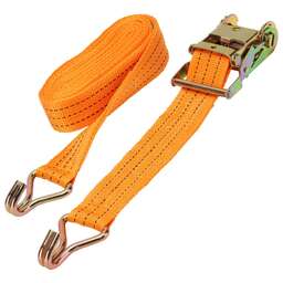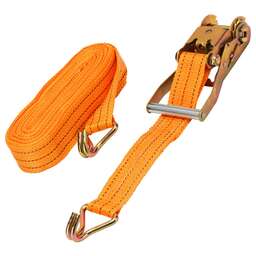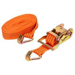 Багажный ремень с крюками Stels 54388 шириной 5 см и длиной 12 м, с храповым механизмом, предназначен для фиксации грузов на решетчатых конструкциях, например, открытых автомобильных багажниках, а также в прицепах. Пригодится для транспортировки различных предметов. Преимущества Износостойкость — ремень изготовлен из прочного и морозостойкого полипропилена, крюки из углеродистой стали устойчивы к деформации. Надежная фиксация груза во время движения и маневров автомобиля — допустимая разрывная нагрузка составляет 800 кг, стальные крюки крепко удерживают натянутый ремень. Комфортное и быстрое затягивание ленты — ремень снабжен храповым механизмом. Удобное хранение — ремень весит 1,774 кг и в сложенном виде очень компактен.