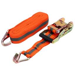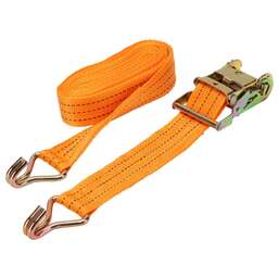 Багажный ремень с крюками Stels 54386 шириной 5 см и длиной 8 м, с храповым механизмом, предназначен для фиксации грузов на решетчатых конструкциях, например, открытых автомобильных багажниках, а также в прицепах. Пригодится для транспортировки различных предметов. Преимущества Износостойкость — ремень изготовлен из прочного и морозостойкого полипропилена, крюки из углеродистой стали устойчивы к деформации. Надежная фиксация груза во время движения и маневров автомобиля — допустимая разрывная нагрузка составляет 800 кг, стальные крюки крепко удерживают натянутый ремень. Комфортное и быстрое затягивание ленты — ремень снабжен храповым механизмом. Удобное хранение — ремень весит 1,1 кг и в сложенном виде очень компактен.