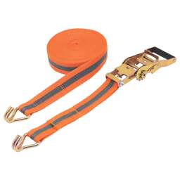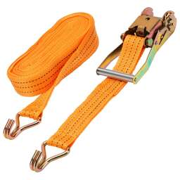 Багажный ремень с крюками Stels 54385 шириной 5 см и длиной 10 м, с храповым механизмом, предназначен для фиксации грузов на решетчатых конструкциях, например, открытых автомобильных багажниках, а также в прицепах. Пригодится для транспортировки различных предметов. Преимущества Износостойкость — ремень изготовлен из прочного и морозостойкого полипропилена, крюки из углеродистой стали устойчивы к деформации. Надежная фиксация груза во время движения и маневров автомобиля — допустимая разрывная нагрузка составляет 800 кг, стальные крюки крепко удерживают натянутый ремень. Комфортное и быстрое затягивание ленты — ремень снабжен храповым механизмом. Удобное хранение — ремень весит 1,52 кг и в сложенном виде очень компактен.