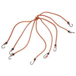 Усиленный багажный паук Stels 54364 с 8 крюками позволяет закрепить груз на решетке открытого багажника, устанавливаемого на крышу легкового автомобиля. 4 шнура длиной 80 см, схваченные кольцом посередине, надежно фиксируют предметы любой формы. Жгуты отличаются особой прочностью и эластичностью, поскольку на 50% состоят из латекса и на 50% — из резины. Изделие будет полезно при транспортировке грузов на дачу или во время путешествия. Преимущества Безопасная транспортировка груза — жгуты в синтетической оплетке выдерживают разрывную нагрузку до 45 кг. Надежность — крюки из углеродистой стали устойчивы к разгибанию при нагрузках. Защита багажника и кузова автомобиля от повреждений — на концах крюков имеются защитные колпачки. Яркий цвет — оранжевые жгуты хорошо заметны на фоне багажа и среди других автомобильных аксессуаров.