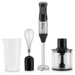 Максимальная мощность 1000 Вт Погружная часть и лезвия из нержавеющей стали Плавная регулировка скорости - 5 скоростных режимов ТУРБО режим Чаша измельчителя объемом 450 мл Стакан для смешивания объемом 700 мл Насадка для взбивания Номинальная потребляемая мощность 400 Вт Электропитание 220-240 В ~ 50-60 Гц