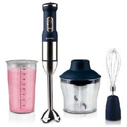 Блендер погружной. Мощность: 900 Вт Материал погружной части: нержавеющая сталь Скоростей/режимов: 8, плавная регулировка скорости Насадки: измельчитель, венчик для взбивания Чаша: 0.5 л, пластик, Цвет: Черный/серебро