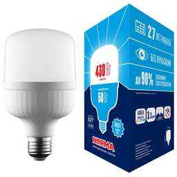 Вес изделия, гр. - 230; Входное напряжение, В - 175-250; Высота изделия, мм - 228; Группа эффективности - Оборотный товар; Диаметр лампы, мм - 125; Диапазон рабочих температур, °С - от -20 до +40; Длина изделия, мм - 125; Индекс цветопередачи, Ra - 80; Класс энергопотребления - A+; Коэффициент мощности - 0,9; Материал корпуса (изделия) - термопластик; Минимальная партия - 1; Мощность, Вт - 50; Свет - дневной белый; Световой поток, Лм - 4 300; Светоотдача, Лм/Вт - 85; Срок гарантии, мес. - 12 месяцев; Срок годности - не ограничен; Срок службы, ч - 25000; Страна производства - Китай; Угол светового потока, ° - 240; Цветовая температура, К - 6500; Цоколь - Е27; Частота, Гц - 50; Ширина изделия, мм - 125; Эквивалентная мощность лампы накаливания, Вт - 430