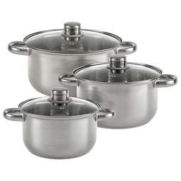 В наборе 6 предметов: кастрюля со стеклянной крышкой 16×10,5см; 2,2л кастрюля со стеклянной крышкой 18×11,5см; 3,0л кастрюля со стеклянной крышкой 20×12,5см; 4,0л Толщина стали 0,5 мм Набор кастрюль из высококачественной нержавеющей стали со стеклянными крышками Специальная форма, исключающая скопление остатков пищи и жира Эргономичный дизайн Термосберегающее дно: пятислойное дно с повышенной термоотдачей Быстрый нагрев пищи, длительное удержание тепла Минимальные потери минеральных веществ, витаминов и вкусовых качеств Подходят для использования на всех типах кухонных плит, включая индукционные Подходят для мытья в посудомоечной машине Серия: Profi Упаковка: цветная коробка