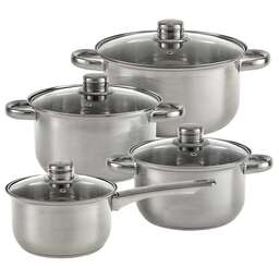 Параметры В наборе 8 предметов: кастрюля со стеклянной крышкой 16×10,5см; 2,2л кастрюля со стеклянной крышкой 18×11,5см; 3,0л кастрюля со стеклянной крышкой 20×12,5см; 4,0л кастрюля со стеклянной крышкой 24×14,5см; 6,6л Толщина стали 0,5 мм Описание Набор кастрюль из высококачественной нержавеющей стали со стеклянными крышками Специальная форма, исключающая скопление остатков пищи и жира Обод, препятствующий переливанию жидкостей через край Термосберегающее дно: пятислойное дно с повышенной термоотдачей Быстрый нагрев пищи, длительное удержание тепла Минимальные потери минеральных веществ, витаминов и вкусовых качеств Подходят для использования на всех типах кухонных плит, включая индукционные Подходят для мытья в посудомоечной машине Серия: Profi Упаковка: цветная коробка