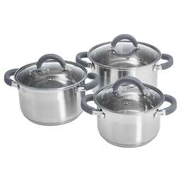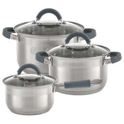 Параметры В наборе 6 предметов: кастрюля с крышкой 16х10,5см; 2,2л кастрюля с крышкой 18х11,5см; 3 л кастрюля с крышкой 20х12,5см; 4 л Толщина стали 0,5 мм Описание Набор кастрюль из высококачественной нержавеющей стали со стеклянными крышками Серия: Standart Термосберегающее дно: пятислойное дно с повышенной термоотдачей Специальная форма, исключающая скопление остатков пищи и жира Обод, препятствующий переливанию жидкостей через край Быстрый нагрев пищи, длительное удержание тепла Минимальные потери минеральных веществ, витаминов и вкусовых качеств Подходит для использования на всех типах кухонных плит, включая индукционные Подходит для мытья в посудомоечной машине Упаковка: цветная коробка