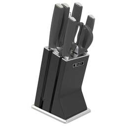 Набор ножей, 9 ПРЕДМЕТОВ, (поварской нож-2,5mm/8", нож разделочный-2,5mm/8", нож-топорик-2,5/6,5", универсальный нож -2,0mm/5", нож для овощей – 2,0mm/3,5", мусат, ножницы, овощечистка с керамическим лезвием) РУЧКИ - НЕРЖАВЕЮЩАЯ СТАЛЬ, СКЛАДНАЯ ПОДСТАВКА