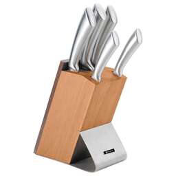 Набор ножей 6 предметов. Лезвие ножей из высококачественной нержавеющей стали: (нож поварской - 2,5mm/8", нож для хлеба - 2,5mm/8", нож разделочный -2,5mm/8", нож универсальный - 2,0mm/5", нож для овощей – 2,0mm/3,5", деревянная подставка для ножей.