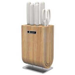 Набор ножей ZEIDAN Z-3138 7 предметов, Лезвие ножей из высококачественной нержавеющей стали : (нож поварской - 1,5mm/8", нож для хлеба - 1,5mm/8", нож разделочный -1,5mm/8", нож универсальный - 1,2mm/5", нож для овощей – 1,2mm/3,5", ножницы, прорезиненные ручки под дерево, подставка для ножей. Подарочная упаковка.