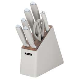 Набор ножей 8 предметов. Лезвие ножей из высококачественной нержавеющей стали: (нож поварской - 1,5mm/8", нож для хлеба - 1,5mm/8", нож-топорик -1,5mm/6,5", нож универсальный - 1,2mm/5", нож для овощей – 1,2mm/3,5", ножницы, мусат, ручки из нержавеющей стали с декором, подставка для ножей из нержавеющей стали.