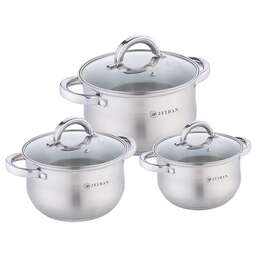 Набор посуды, 6 предм. Z-50666 (3 КАСТРЮЛИ С КРЫШКАМИ: 2.1 Л (d16 см ), 3.0 Л (d18 см ), 4.0 Л (d20 см ), нержавеющая сталь, 5-ти СЛОЙНОЕ КАПСУЛИРОВАННОЕ ДНО, крышки - стекло, внутренняя - матовая полировка, снаружи – комбинированная полировка.