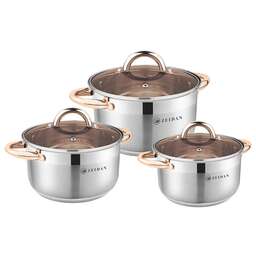 Набор посуды ZEIDAN Z-50657 6 предметов, Набор кастрюль, 6 предм. (3 КАСТРЮЛИ С КРЫШКАМИ: 2.0 Л (d16 см ), 2,7 Л (d18 см ), 3,6 Л (d20 см ), нержавеющая сталь, 3-x СЛОЙНОЕ КАПСУЛИРОВАННОЕ ИНДУКЦИОННОЕ ДНО, крышки - стекло, ручки на корпусе и крышке "ПОД ЗОЛОТО", комбинированная полировка снаружи, матовая полировка внутри. Подарочная упаковка.