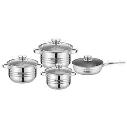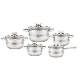Набор посуды, 10 предм. (4 КАСТРЮЛИ С КРЫШКАМИ: 1.7 Л (d16 см), 2.5 Л (d18,0 см), 3.4 Л (d20 см ), 5.9 Л (d24 см ), СОТЕЙНИК С КРЫШКОЙ – 1,7 Л ( d16 см), нержавеющая сталь, комбинированная полировка снаружи, зеркальная полировка внутри, крышки - стекло, 5-ти СТЕПОВОЕ КАПСУЛИРОВАННОЕ ИНДУКЦИОННОЕ ДНО.