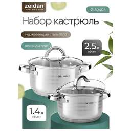 Набор посуды ZEIDAN Z-50404 4 предм. , Набор посуды, 4 предм. (2 КАСТРЮЛИ С КРЫШКАМИ: 1.4 Л (d14 см ), 2.5 Л (d18 см ), нержавеющая сталь, 5-ти СТЕПОВОЕ КАПСУЛИРОВАННОЕ ДНО, крышки - стекло, внутри - зеркальная полировка корпуса, снаружи -комбинированная полировка корпуса.