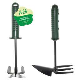 Садовая мотыга 2 в 1 Материал: конструкционная сталь, покрытие - порошковая эмаль; ручка - пластик Размер: 30х18х7 см. Вес 205 г. Длина тяпки: 9 см. Длина зубьев: 8 см. С одной стороны рыхлитель с тремя зубьями, с другой- тяпка На конце рукоятки подвес Рукоятка эргономичная, ребристая, опора под большой палец.
