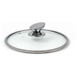 Стеклянные крышки с металлическим ободком и паровыпуском изготавливаются согласно ГОСТ Р51969-2002. При производстве крышек используетсялистовое термостойкое стекло толщиной 4 мм марки М1-М4. Специальная термическая обработка стекла делает его ударопрочным и более устойчивым к изменениям температур, а метод штамповки обеспечивает большую легкость и прозрачность штампованных крышек по сравнению с литыми. Обод и заклепка паровыпуска выполнены из высококачественной нержавеющей стали марки AISI 201. Они предотвращают сколы на стекле при эксплуатации. Ручка изготовлена из термостойкого пластика. Использование стеклянных крышек позволяет контролировать процесс приготовления пищи без потери тепла. Можно мыть в посудомоечной машине.