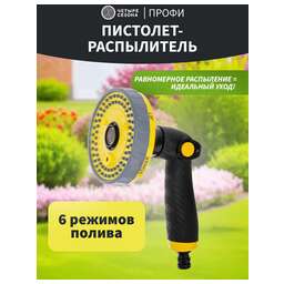 Пистолет-распылитель со штуцерной посадкой и курком, расположенным сзади. Оснащен регулируемой форсункой, что обеспечивает семь режимов полива: душ, режим задействования всех отверстий, мелкий туман, плоско-вертикальную струю, плоско-горизонтальную струю, туман, жесткую струя. Имеет фиксатор курка для непрерывной работы. Предназначен для всех типов полива на дачных участках, в садах, парках и скверах, а также для очистки. Совместим со всеми элементами системы полива Palisad и Palisad Luxe. Корпус, рукоятка и курок пистолета изготовлены из прочного АБС-пластика.