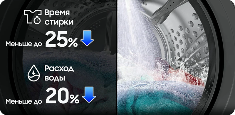 Стирайте одежду с меньшими затратами электроэнергии. Стиральная машина Samsung отличается высокой экономичностью и даже на 10%* превосходит минимальные требования по этому показателю для бытовой техники класса А. Передовые технологии повышают эффективность стирки и сокращают время рабочего цикла, что снижает энергопотребление.