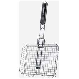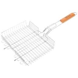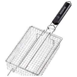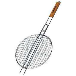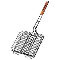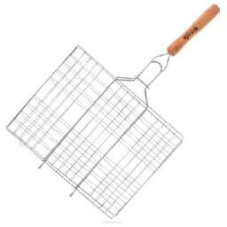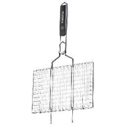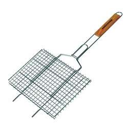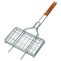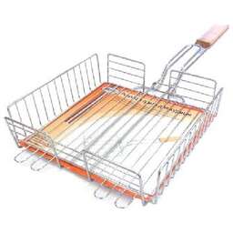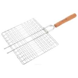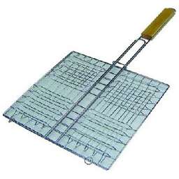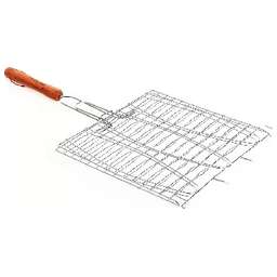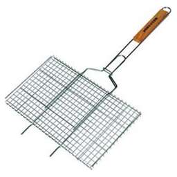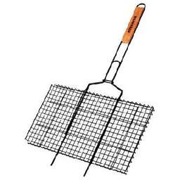 высококачественная пищевая сталь,дерево Предназначение: для приготовления пищи на углях. 3-х секционная решетка. Используется для приготовления рыбы. 3.6/2.1/1.7mm Индивидуальная упаковка: бумажный вкладыш + ярлычок на ручке. Общая длина с усиками: 58см