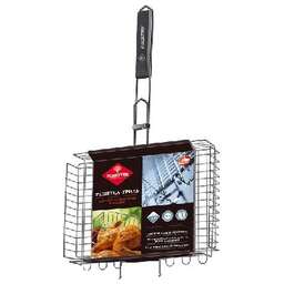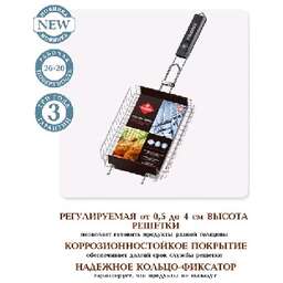Конструкция решетки позволяет фиксировать верхнюю плоскость на разной высоте. Можно запекать продукты различной толщины: от стейков до куриных окорочков. Размер рабочей поверхности: 24х30 см. Высококачественная сталь с двойным пищевым покрытием.