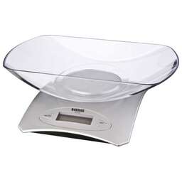 Весы кухонные, Максимальный вес 5 кг, Цена деления 1 г, Функция «Тара», Платформа из нержавеющей стали, Взвешивание продуктов и определение объема жидкости, Автоматическое и ручное отключение, Индикатор замены батарейки, 4 высокочувствительных датчика, Единицы измерения: г/унция/ фунт: унция/ мл, LCD дисплей, Нескользящие ножки, Индикатор перегрузки, Питание 2 x 1.5 В AAA батарейки (в комплекте)