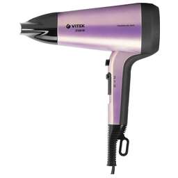 Фен. Мощность: 2200 вт, Количество режимов: 3 режима температуры / 2 скорости воздушного потока, Количество режимов интенсивности воздушного потока: 2, Подача холодного воздуха, Насадка-концентратор, Защита от перегрева, Петля для подвешивания, Длина сетевого шнура: 1,8 метра, Съемный фильтр, Ионизация (Турмалиновая ионизация), Количество режимов нагрева: 3, Цвет: Сиреневый/черный