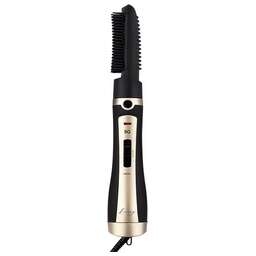 Фен-щетка, Мощность - 1200 Вт, Количество режимов - 2, Плоская щетка, Ионизация (Турмалиновая ионизация + Керамическое покрытие), Круглая щетка с щетиной 32мм, Подача холодного воздуха, Петля для подвешивания, Длина сетевого шнура - 1,8 метра, Индикация включения, Защита от перегрева, Вращение шнура, Диаметр насадки-щетки: 32 мм. Цвет: Черный/золото
