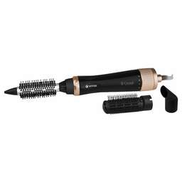 Фен-щетка, Мощность - 1000 Вт, Количество режимов - 2, Ионизация, Насадка-концентратор, Плоская щетка, Подача холодного воздуха, Петля для подвешивания, Длина сетевого шнура - 1,8 метра, Защита от перегрева, Вращение шнура, Диаметр насадки-щетки: 20 мм. Цвет: Черный/золото