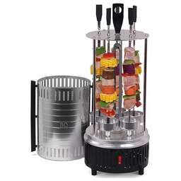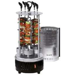 Мощность: 1000 Вт, Количество режимов: 1, Количество шампуров: 5 шт, Температура нагрева: До 240'C, Вращение шампуров: До 2.7 об/мин, Автовращение шампуров, Съемные чашки для сбора жира, Индикация включения, Материал нагревательного элемента: Керамика, Длина шампура: 30.9 см, Длина сетевого шнура: 1.2 м, Прорезиненные ножки