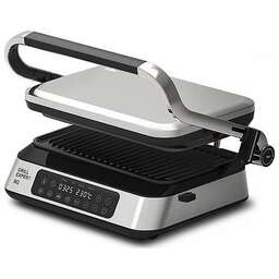 Мощность 2200 Вт / Электронное управление / 11 автоматических программ степень прожарки говядины 4 уровня (MED RARE, MED, MED WELL, WELL DONE) + 7 программ настройки (курица, панини, хот-дог, хлеб, рыба, бекон и овощи) + DIY (do it yourself – «сделай сам») / Раскрытие рабочей поверхности 0', 110', 180' / Защита от перегрева / 2 комплекта сменных панелей с антипригарным покрытием в комплекте ( для гриля двухсторонняя (гладкая и рифленая), рифленая для бельгийских вафель) / Длина сетевого шнура 1 м