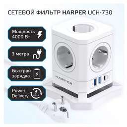 Сетевой фильтр HARPER UCH-340 - 1.5 м./мощность нагрузки 4000 Вт/ ток нагрузки 16 А/ Количество розеток 3/ Количество USB портов 3/ Поддержка быстрой зарядки (Power Delivery 3.0)/ Максимальная сила тока на 1 USB порт 3 А/ Суммарная сила тока для всех портов USB 4.8 А/ Выключатель с защитой от перегрузок/ Защитные шторки/ Индикатор работы Индикатор заземления/ Индикатор защиты от перепада напряжения/ Заземление/ Отверстия для крепления на стену