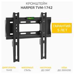 Назначение: для LCD- и LED-телевизоров. Совместимость с диагональю ТВ: 17, 24, 32, 40, 42, 43. Тип кронштейна: фиксированный. Совместимость: поддерживает ТВ с диагональю 17-43. Максимальный вес ТВ: 30 кг. Крепление стандарта Vesa: до 200х200. Типы VESA: 100x100, 100x200, 200x200, 75x75. Угол наклона: 0°. Материал корпуса: сталь. Минимальное расстояние от стены: 30 мм. Максимальное расстояние от стены: 30 мм. Комплектация: Настенная пластина, вертикальные профили, крепежные детали, встраиваемый уровень, руководство по эксплуатации, гарантийный талон. Цвет: черный. Размеры (ШхВхГ): 250x233x30 мм. Вес: 0.53 кг.