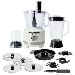 Универсальный кухонный комбайн мощностью 1000 Вт с 6 скоростями и импульсным режимом станет идеальным помощником на кухне. Прибор работает от сети 220-240 В и оснащен тремя емкостями: чаша измельчителя (3 л), блендер (1,5 л, стеклянная чаша) и кофемолка (0,5 л). Корпус выполнен из прочного пластика, а режущие элементы - из нержавеющей стали. Элегантный зефирный цвет придает устройству стильный вид. Комбайн предлагает широкий диапазон скоростей от 5000 до 18000 об/мин с автоматическими режимами: колка льда (40 сек), приготовление смузи (3 мин), замес теста, измельчение (30 сек) и самоочистка (6,5 сек). Удобное ручное управление с бесступенчатой регулировкой и светодиодной подсветкой делает процесс приготовления комфортным. В комплектацию входят: основание с чашей, блендер, эмульгатор, ножи для измельчения и теста, лопатка, 4 диска для нарезки, соковыжималка, кофемолка, а также руководство пользователя и две коробки (подарочная и транспортировочная).
